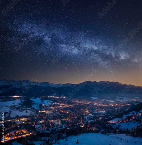 Wall mural illuminated zakopane in winter at night and milky way
