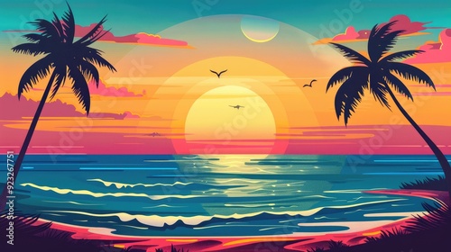 Wall mural illustrate a vector graphic of a beach scene with a gradient sunset, featuring silhouettes of palm t