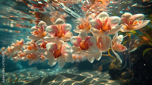 The watermark will not be included on Wall mural.: Illustrate an underwater scene where delicate orchids float gently in a shallow stream