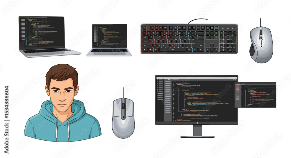 Wall mural : Illustration depicting a programmer with laptops keyboard mouse and monitor displaying code view