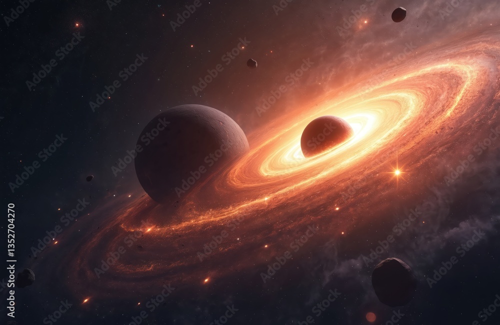 The watermark will not be included on Wall mural.: Illustration of a black hole with bright star in center and planet, asteroid and galaxy - cosmic obje