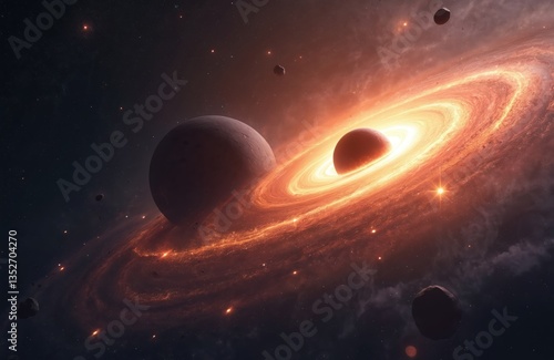 Wall mural illustration of a black hole with bright star in center and planet, asteroid and galaxy. cosmic obje - Wall murals Wall mural illustration of a black hole with bright star in center and planet, asteroid and galaxy. cosmic obje - Wall murals