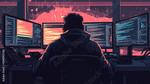 Wall mural : Illustration of a deep dark web bad actor hacker sitting in front of multiple monitor screens that d