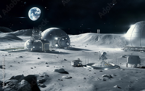 Wall mural : Illustration of a new space station on the moon - lunar base with advanced infrastructure sits under