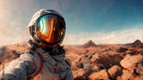 The watermark will not be included on Wall mural.: Illustration of astronaut taking selfie in the outer space and planet earth on background - ai genera