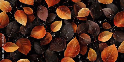 Wall mural illustration of autumn leaves with water droplets scattered on a black background. nature pattern wi