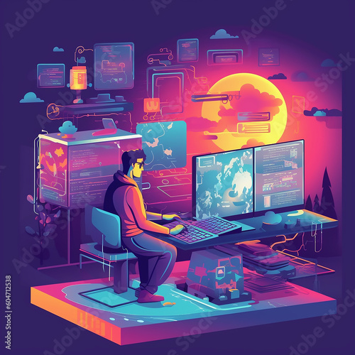 Wall mural : Illustration of software development, 3d web programming art, programmer sitting with laptop working