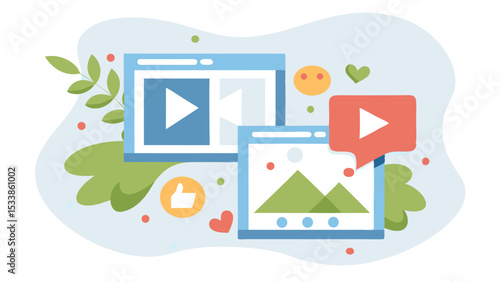 Illustration of video and image content with like button and heart icons on a light backgroundWall mural