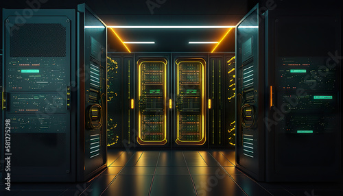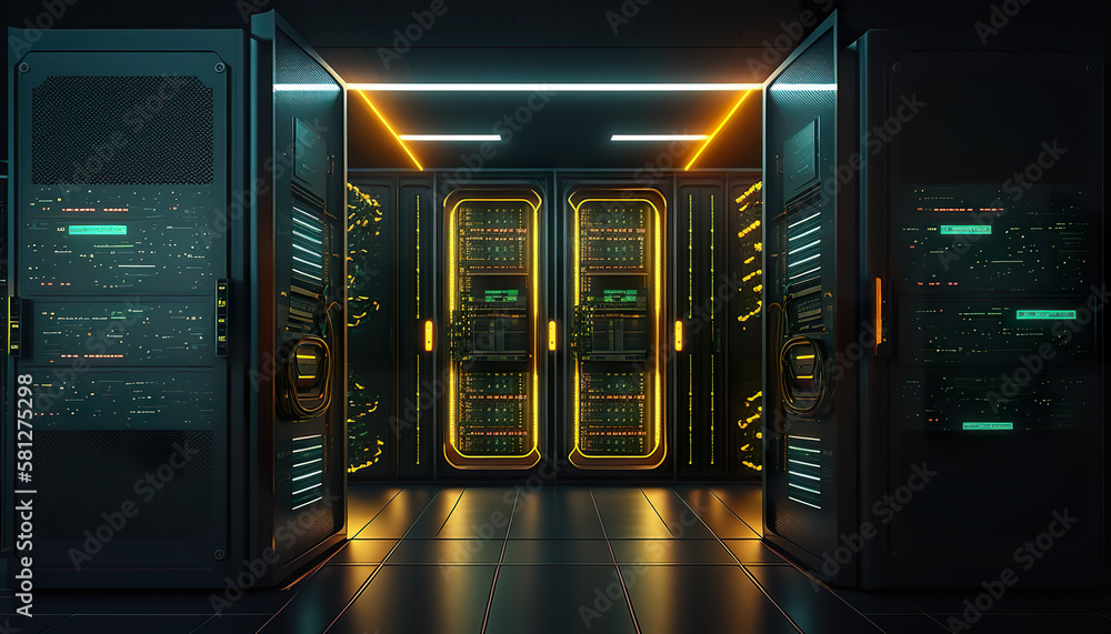 Wall mural illustration server racks in server room data center. 3d render of digital data and cloud technology - Wall murals Wall mural illustration server racks in server room data center. 3d render of digital data and cloud technology - Wall murals