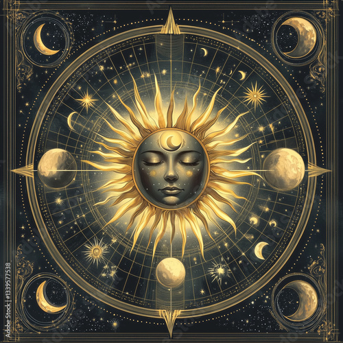The watermark will not be included on Wall mural.: Illustration set of moon phases - different stages of moonlight activity in vintage engraving style -