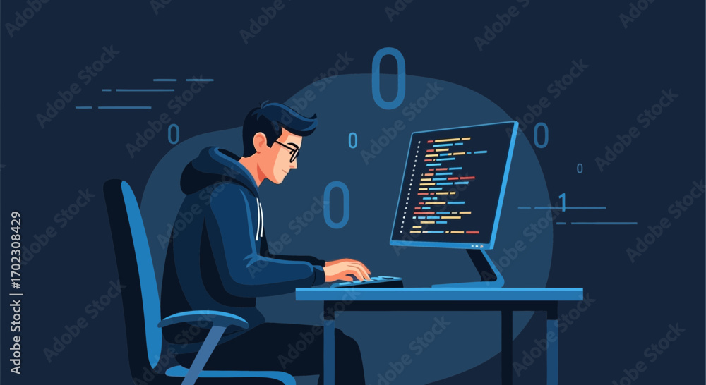 Wall mural : Illustrative vector of a coder working on programming on a computer at a desk