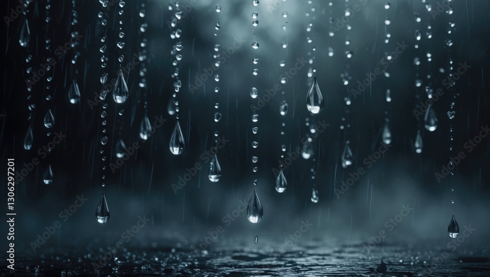 The watermark will not be included on Wall mural.: Image depicting a downpour against a dark backdrop - featuring lifelike raindrops in various light an