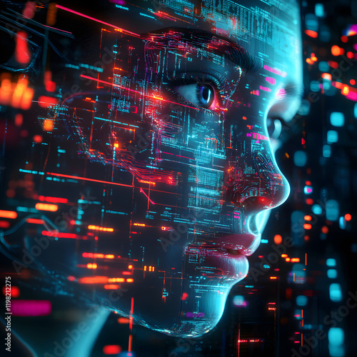 Wall mural image of a girl with a hologram of a digital network and connections. technological design. interact - Wall murals Wall mural image of a girl with a hologram of a digital network and connections. technological design. interact - Wall murals