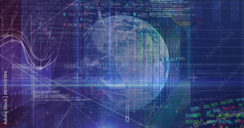 The watermark will not be included on Wall mural.: Image of data processing, graphs and connections over globe in blue space