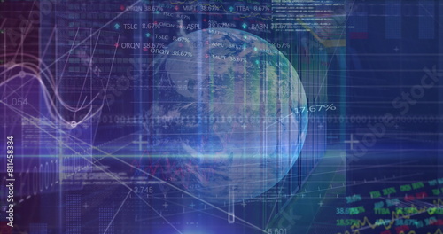 Wall mural image of data processing, graphs and connections over globe in blue space - Wall murals Wall mural image of data processing, graphs and connections over globe in blue space - Wall murals