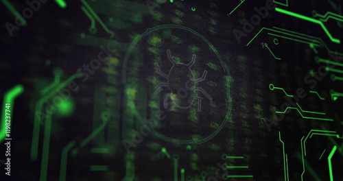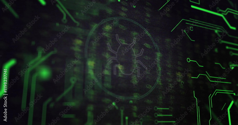 Wall mural image of data processing and bug icon on black background