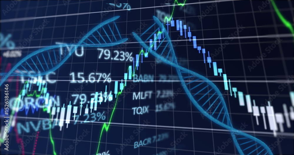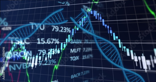 Wall mural image of data processing and dna strands on black background - Wall murals Wall mural image of data processing and dna strands on black background - Wall murals