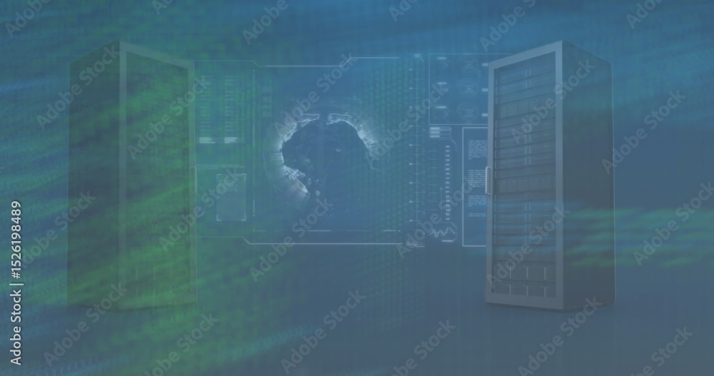 Wall mural image of data processing and globe on blue background - Wall murals Wall mural image of data processing and globe on blue background - Wall murals