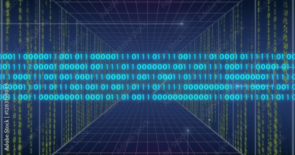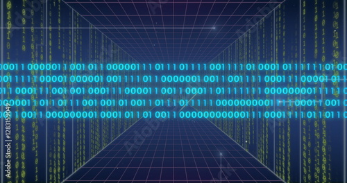 Wall mural image of data processing over light trails on blue background - Wall murals Wall mural image of data processing over light trails on blue background - Wall murals