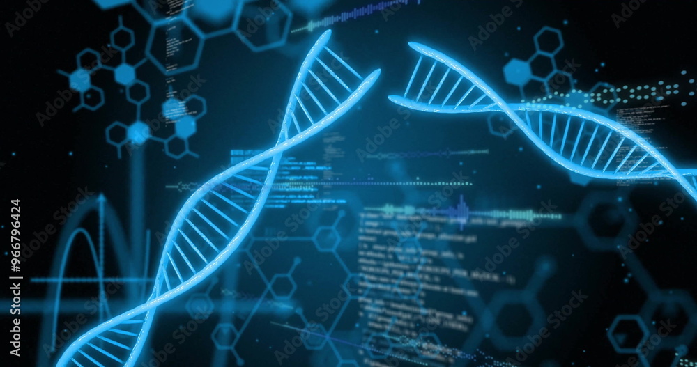 Wall mural image of digital data processing and dna strands on black background - Wall murals Wall mural image of digital data processing and dna strands on black background - Wall murals