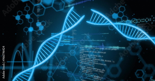 The watermark will not be included on Wall mural.: Image of digital data processing and dna strands on black background