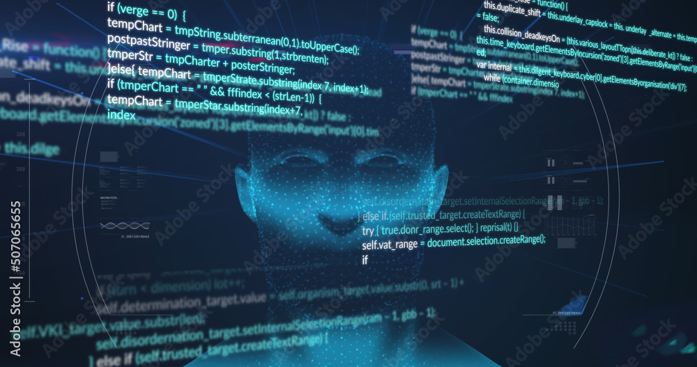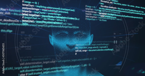 The watermark will not be included on Wall mural.: Image of digital head and data processing on blue background
