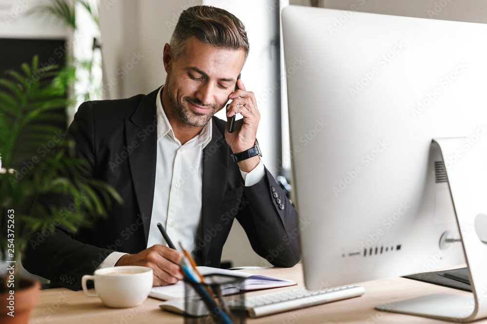 Wall mural : Image of handsome businessman talking on cell phone while working on computer in office