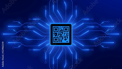 Wall mural image of qr code between information connecting lines in the middle on futuristic digital circuit te