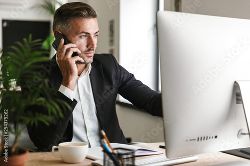 Wall mural : Image of smart businessman talking on cell phone while working on computer in office