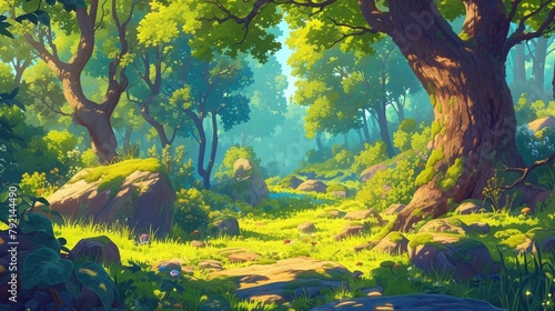 The watermark will not be included on Wall mural.: Immerse yourself in a vibrant cartoon forest setting where lush deciduous trees moss covered rocks s