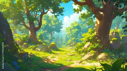 The watermark will not be included on Wall mural.: Immerse yourself in a vibrant cartoon forest setting where lush deciduous trees moss covered rocks s