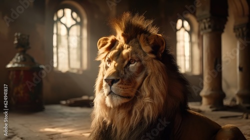 The watermark will not be included on Wall mural.: Imposing lion inside a temple - created with generative ai -