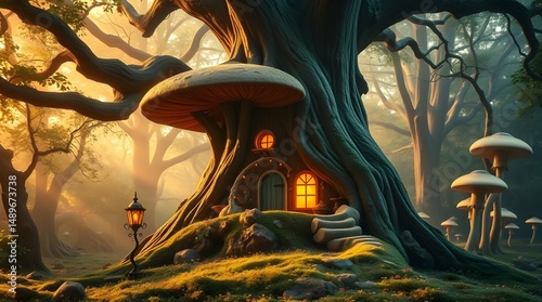 The watermark will not be included on Wall mural.: In a mystical forest, a whimsical treehouse with illuminated windows nestles beneath a giant mushroo