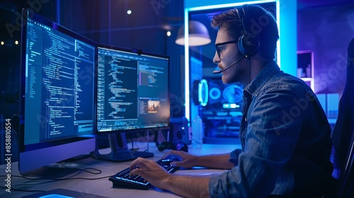 Wall mural in an it office setting, a programmer is engaged in software development, typing data and coding on  - Wall murals Wall mural in an it office setting, a programmer is engaged in software development, typing data and coding on - Wall murals