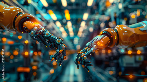 Wall mural in the future, robots or cyborgs with artificial intelligence will control manipulator arms on facto - Wall murals Wall mural in the future, robots or cyborgs with artificial intelligence will control manipulator arms on facto - Wall murals