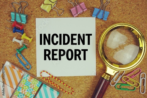 The watermark will not be included on Wall mural.: Incident report text on paper card with magnifying glass and stationery on cork board background