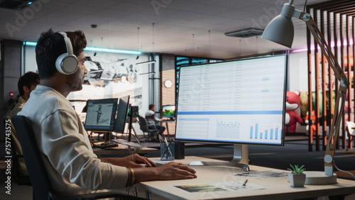 Wall mural : Indian male manager using desktop computer with analytics software wth financial reports - man workin