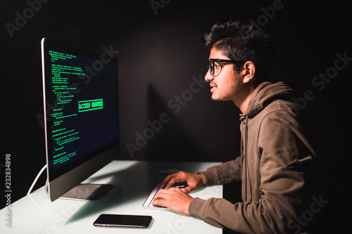 Wall mural : Indian man programmer working on desktop computer at white desk in office -