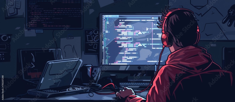 Wall mural individual seated at a workstation with a desktop computer and a monitor - Wall murals Wall mural individual seated at a workstation with a desktop computer and a monitor - Wall murals