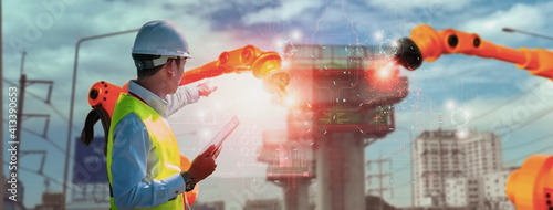 Wall mural industry engineer construction,using smart tablet,control automation robot arm machine intelligence