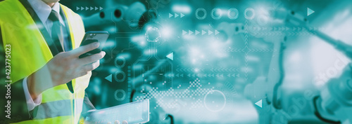 Wall mural industry engineer construction,using smart tablet,control automation robot arm machine intelligence
