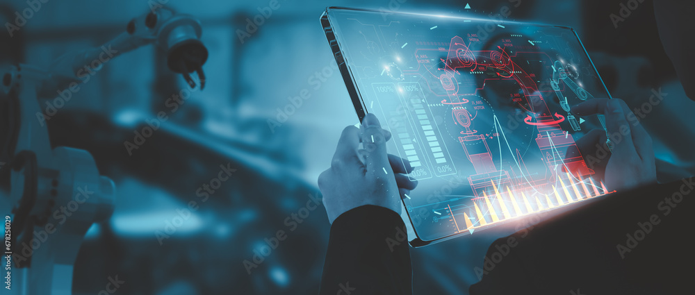 Wall mural industry engineer in factory,using smart tablet glass device,control automated robot arm machine lea