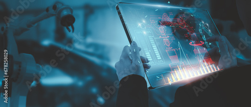 The watermark will not be included on Wall mural.: Industry engineer in factory,using smart tablet glass device,control automated robot arm machine lea