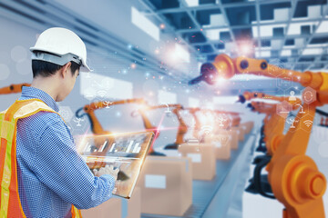 Wall mural industry engineer in factory,using visual smart tablet device,control automated robot arm machine le
