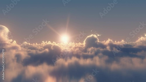 Wall mural infinite fly above clouds at sunset - realistic 3d render - seamless video in pov