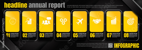 Infographics design, 8 process chart diagram template for presentation workflow, abstract timeline eWall mural