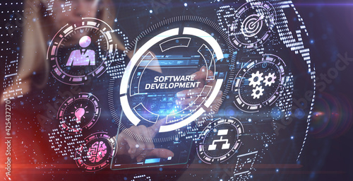 Wall mural inscription software development on the virtual display. business, modern technology, internet and n