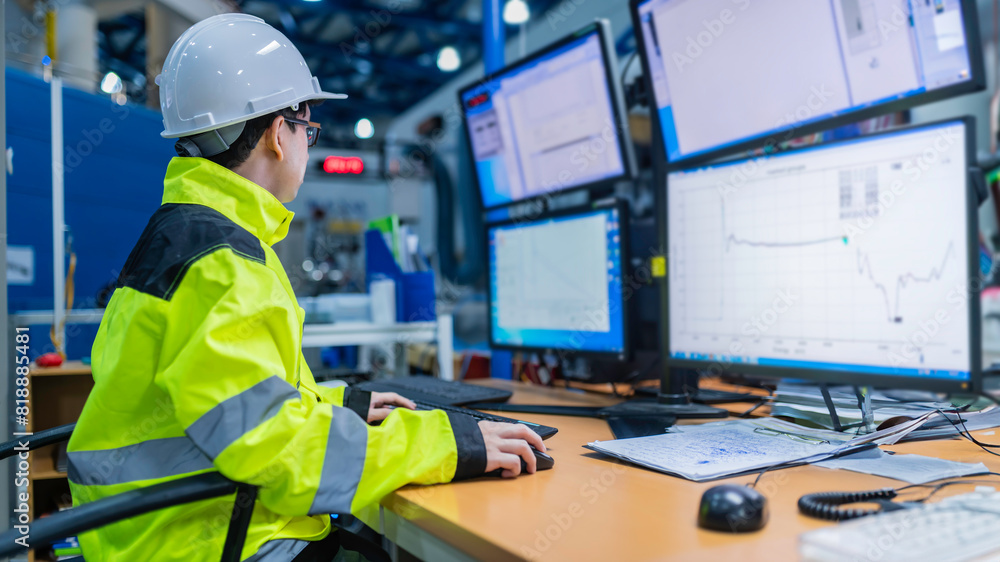 Wall mural : Inside the large industry factory female computer engineer works on personal computer she coding pro