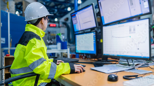 The watermark will not be included on Wall mural.: Inside the large industry factory female computer engineer works on personal computer she coding pro