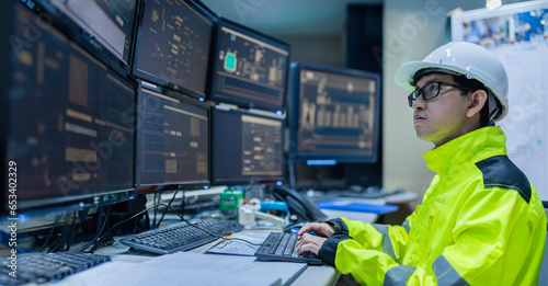 Wall mural : Inside the large industry factory female computer engineer works on personal computer she coding pro